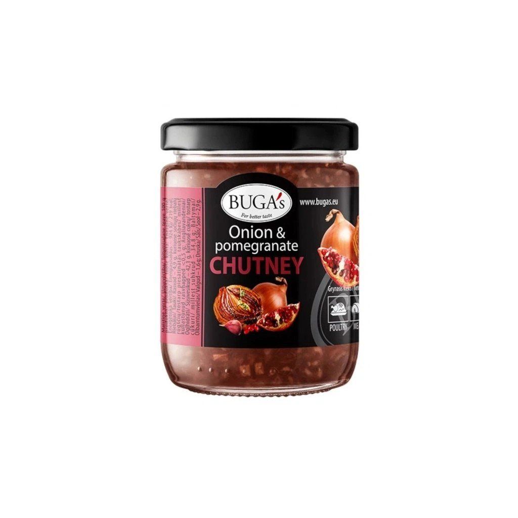 Buga´s Čatní z cibule a granátového jablka 170g – sladkokyslé čatní s jemne karamelizovanou cibuľou a výraznou chuťou granátového jablka, ideálne k mäsu, syrom alebo ako dip.