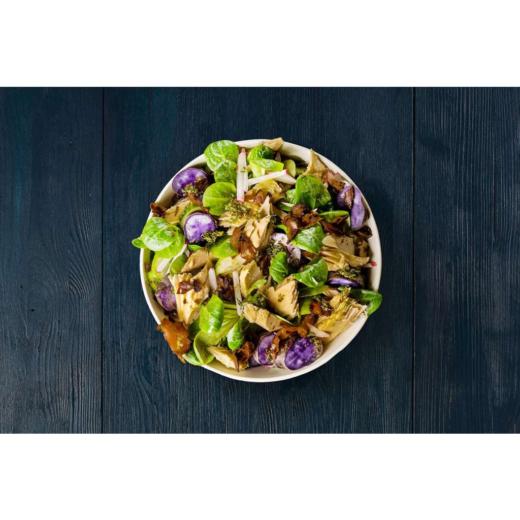 4. Do misky dajte zemiakové plátky, valeriánku, reďkovky a plátky uhorky. Sceďte tuniaka a rozotrite ho na šalát. Navrch šalát dajte slaninu a pokvapkajte dresingom.