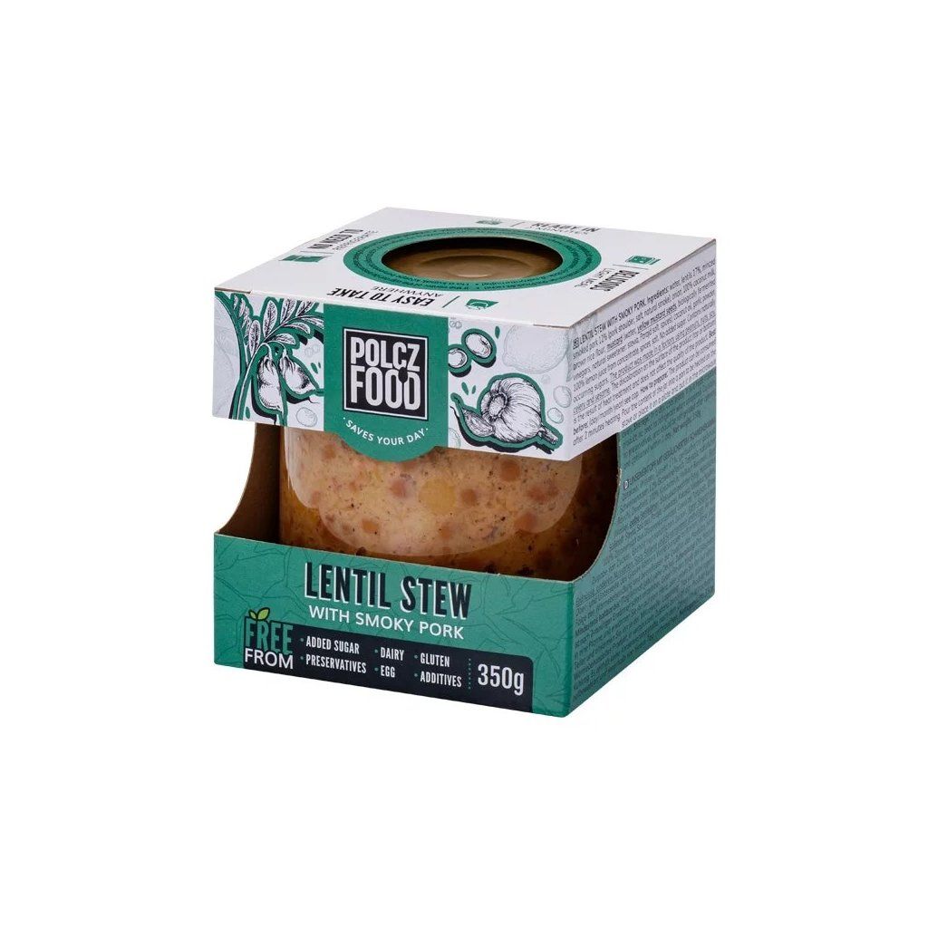 Zloženie: pitná voda, šošovica 17%, mleté údené rebrá 12% (bravčové mäso, jedlá soľ, prírodný dym), červená cibuľa, 100% kokosové mlieko, hnedá ryžová múka, horčica (pitná voda, žlté horčičné semienko, cesnakový prášok >1%, 100% citrónová šťava z koncentrátu, korenie, jedlá soľ
