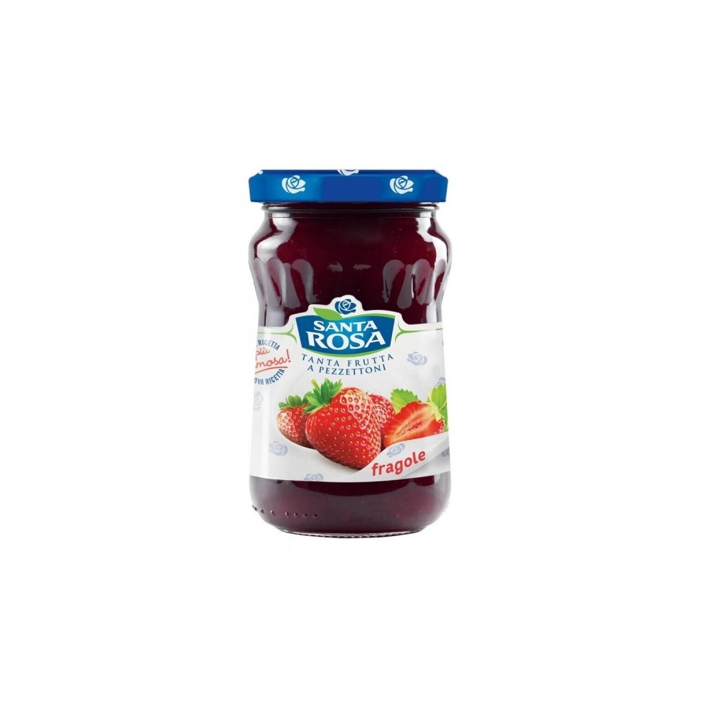 Santa Rosa Jahodový džem 350g je tradičný taliansky ovocný džem zo starostlivo vybraných jahôd s výraznou sladkou chuťou, jemnou konzistenciou a autentickou jahodovou vôňou, ktorý je ideálny na mazanie na pečivo, do jogurtov, dezertov alebo ako súčasť sladkých receptov a prináša klasický ovocný zážitok vďaka kombinácii jahôd, cukru, glukózo-.